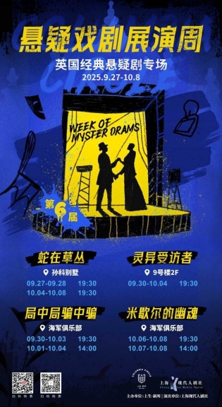 此外,在海军俱乐部还将分别上演英国悬疑名剧《米歇尔的幽魂》和《局中局骗中骗》。《米歇尔的幽魂》由现代人剧社自2010年首演以来,已巡演过全国二十余座城市,受到观众的一致好评。在伦敦西区美人鱼剧院与纽约外百老汇桂格剧院双城热演的悬疑剧《局中局骗中骗》(又名《穿过满是猫的巷子》)今年再度归来,不断反转的剧情让观众应接不暇。9号楼还将上演英国悬疑剧《灵异受访者》。